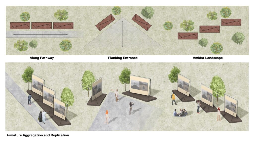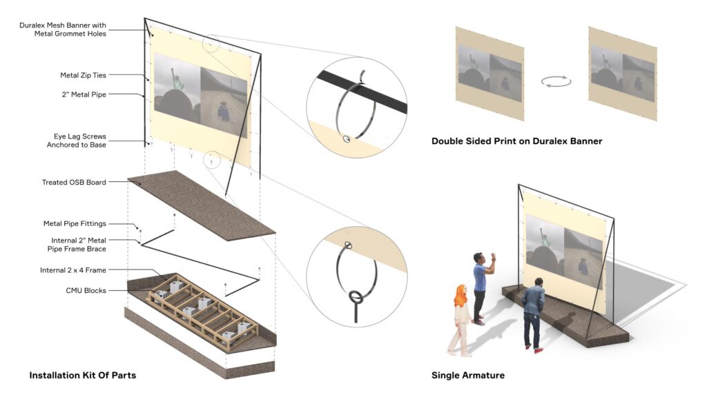 In order to manage the scale and replication, the installation needed to be simple yet durable to handle outdoor elements and public use. With a minimal budget, structural elements were created from scrap material like weighted platform created from left-over OSB and plywood which encased unused bricks. Other inexpensive choices included simple pipes and fitting as a frame for stretching a double-sided printed canvas secured with metal zip ties. While simple in materials, the design team including structural engineers contributed efforts to ensure the armature would resist wind-loads and over-turn due which determined details in the porosity of canvas, connections and weight of ballast. In addition, to considering damage by graffiti and the desire to easily reinstall these in other locations or indoors.