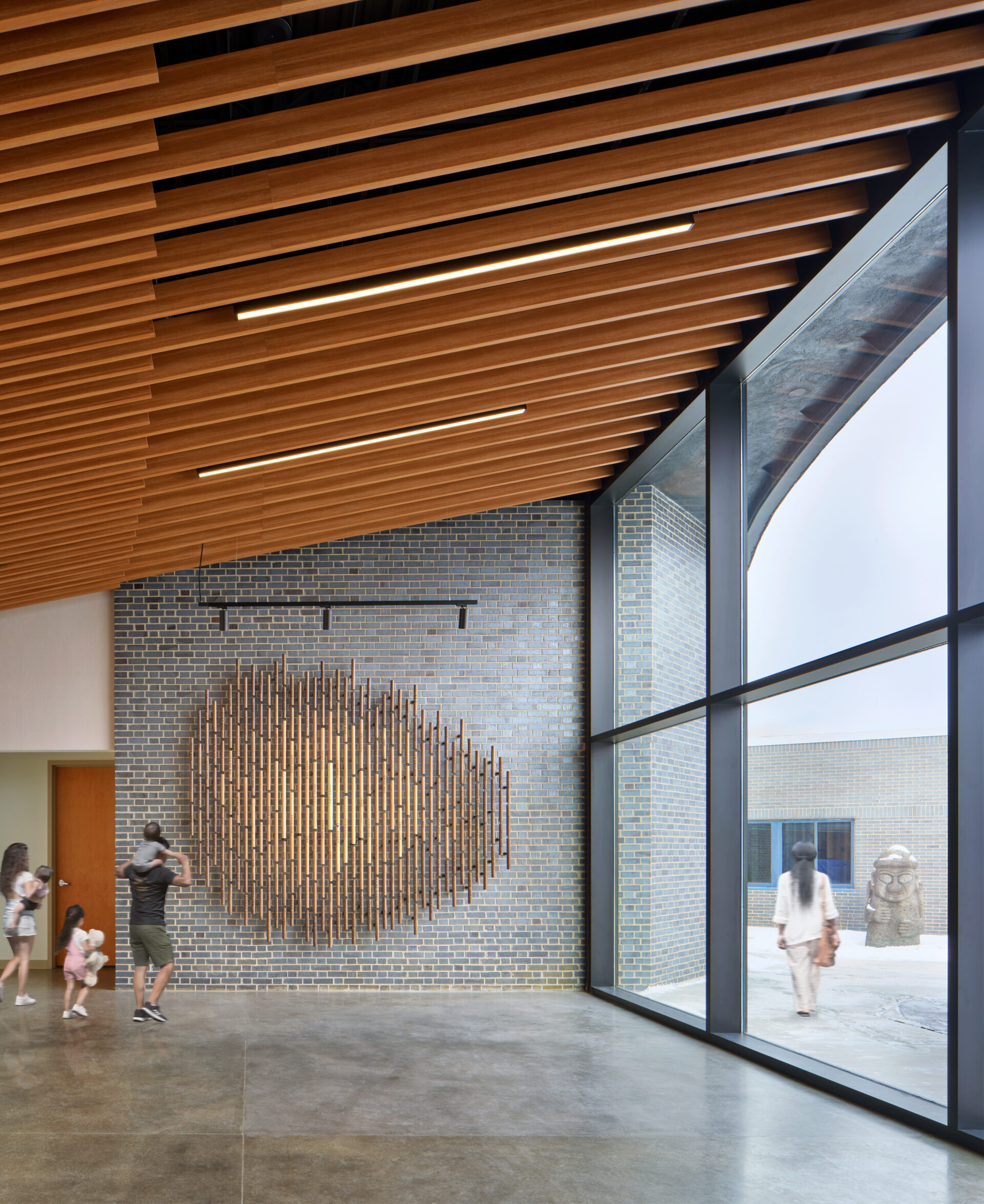 Tasked with creating interiors as inspiring as the community it serves, a donor wall in the pre-function space was designed, drawing inspiration from traditional Korean architecture. The repeating dowels reflect the pattern of wood members found in the canopies of Korean buildings. Each dowel is engraved with the names of donors, with varying sizes and stains to represent their level of contribution.