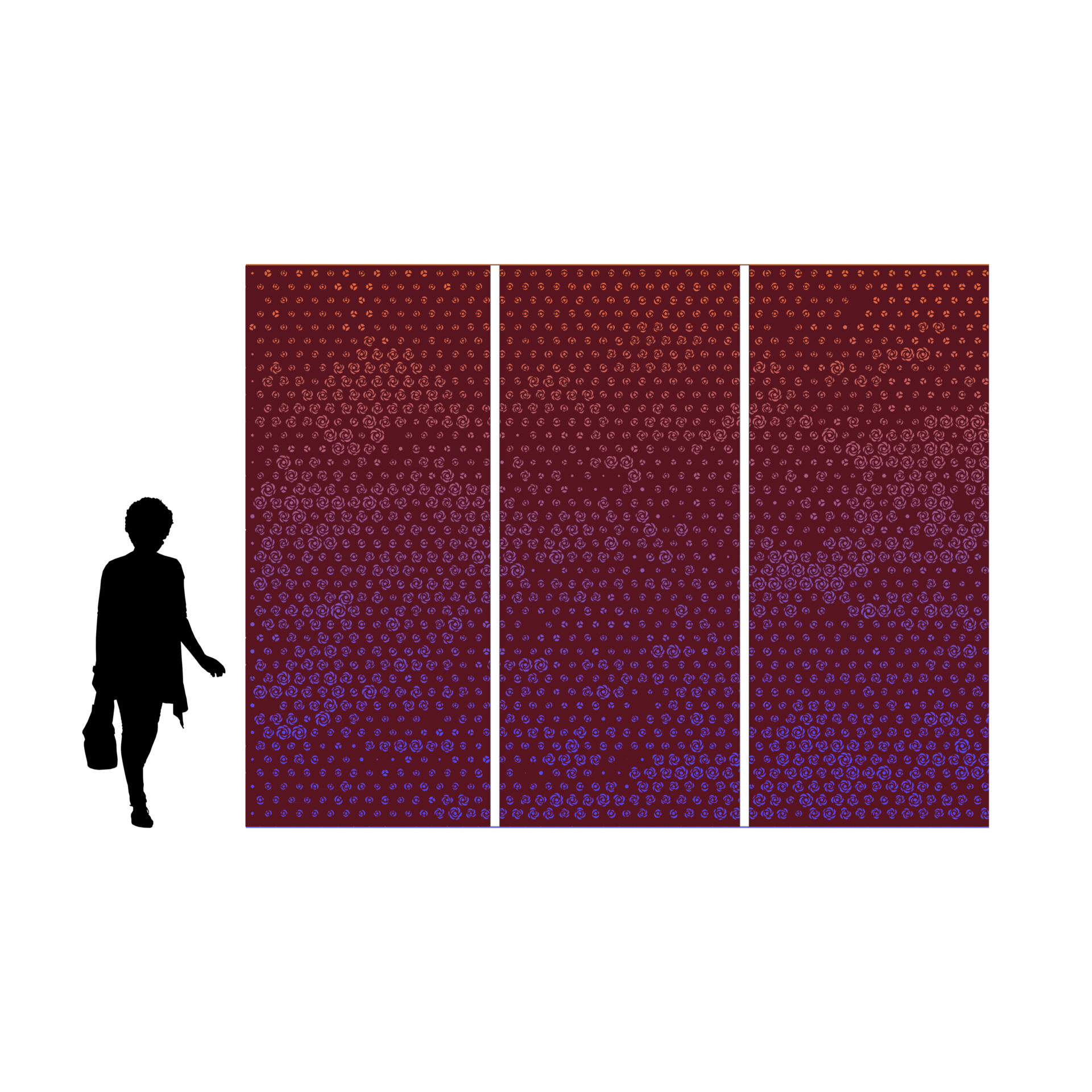 In the multi-purpose space, a secondary feature combines function and beauty. Inspired by the traditional Korean art, the 10 Symbols of Longevity (십장생도), which represents longevity, immortality, and harmony, the design features abstracted symbols overlaid by peonies, symbolizing prosperity. The vibrant colors of the original artwork influence the size and petal count of each peony, from small buds to full blossoms. CNC-cut into acoustic felt panels, the design showcases detailed peonies up close, while the full image comes together from a distance.